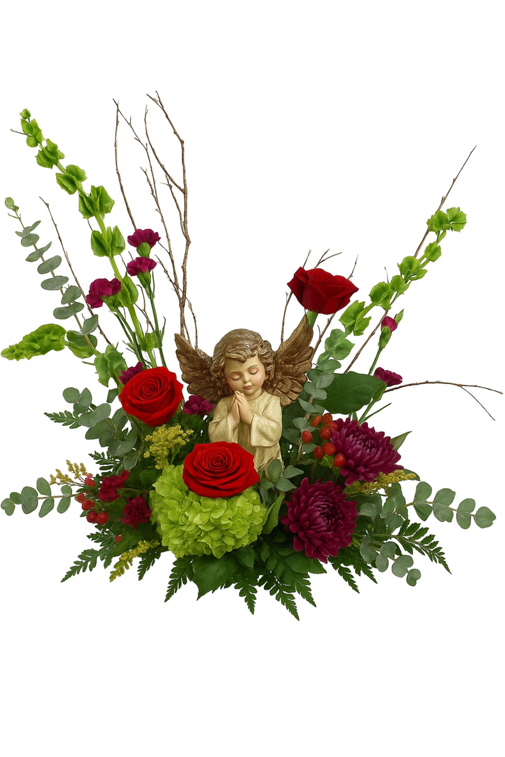 Grace and serenity come together in this peaceful floral tribute. Featuring a beautifully crafted praying angel surrounded by lush red roses, green hydrangea, deep plum chrysanthemums, and vibrant accent blooms, Heaven’s Prayer Garden offers a heartfelt expression of comfort and faith. The natural branches and greenery frame the angel in a heavenly embrace, symbolizing eternal love and gentle remembrance.