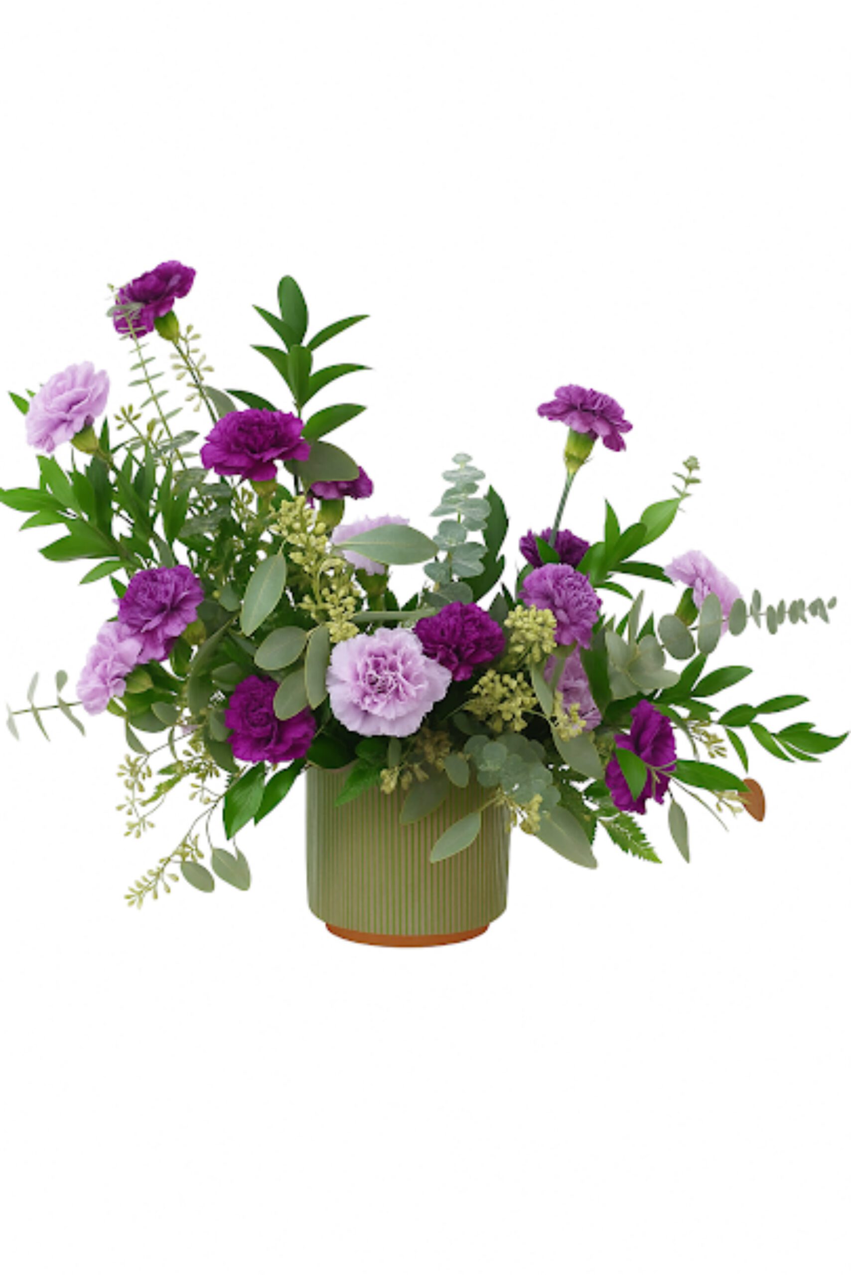 Soft and serene, Whispering Grace is a heartfelt expression of comfort and remembrance. This elegant arrangement features soothing shades of lavender and deep purple carnations nestled among lush greenery and eucalyptus. The flowers are artfully arranged in a modern sage green ceramic vase, symbolizing peace, compassion, and enduring love.